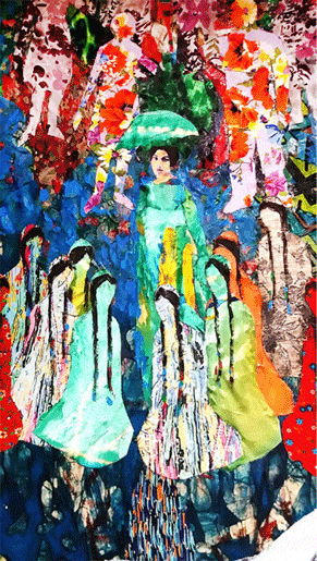 شخصیتهای تاریخی، دینی و ستارههای محبوب غربی شانهبهشانهی نگارهها و زنان ترکمن زدند، همه و همه بازیگر بافت و نقش یکپارچهای شدند که اگر تار و پود یکی را میکشیدی بقیه هم بهم میریخت. ردپای نگارگری ایرانی هم به طرز تکرار شوندهای در نقاشیها دیده می شود. داستانهای ادبیاتفارسی به شکل تکهتکه از نگارگری سدههای قبل، در آثار او کلاژ تصویری شدهاند. از بهرام و هفتگنبد تا رستم و سهراب ، چهره دیوان و اسبان ناز بنیاد و طوطیان شکرشکن و غیره. زنان در یک قالب مشابه، به وفور نقش شدهاند، با نشانههای مخصوص به آنان؛ انواع پارچههای رنگین با گلها و طرحهای ریز و درشت، با این همه نمیتوان گفت که این نمایش دنیایی زنانه است زیرا بیشتر به ظواهر امر پرداختهشده یعنی گیسوان کمند و اندام رعنا و تنپوش خوشرنگ و سازهایی در دست، آنگونه که زنان باید در جوامع سنتی باشند؛ نجیب و زیبا، حامی و مهربان، خموش و دارنده هنرهای مفرح