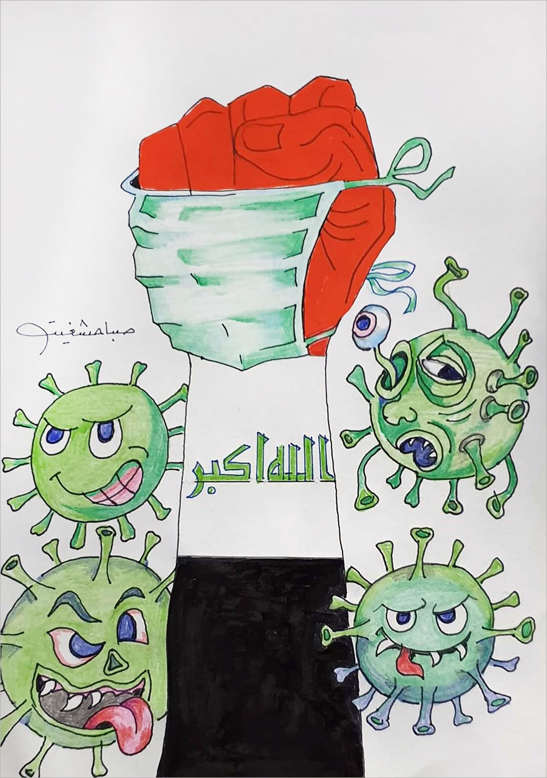 به گزارش روابط عمومی مرکز تجسمی حوزه هنری به نقل از فارس، «صباح شغیت» هنرمند ساکن استان میسان عراق، اکثر کارتونها و نقاشیهای اخیر خود را به پویش مبارزه با ویروس کرونا اختصاص داده است.