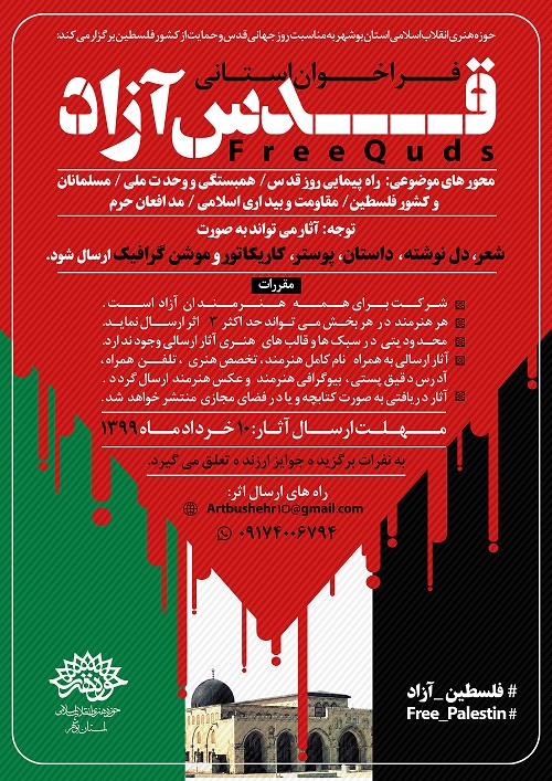 به گزارش روابط عمومی حوزه هنری استان بوشهر، راه پیمایی روز قدس، همبستگی و وحدت ملی، مسلمانان و کشور فلسطین، مقاومت و بیداری اسلامی و مدافعان حرم از محورهای موضوعی این فراخوان بوده که در بخش های شعر، داستان، دل نوشته، کاریکاتور و موشن گرافیک برگزار شده است.
