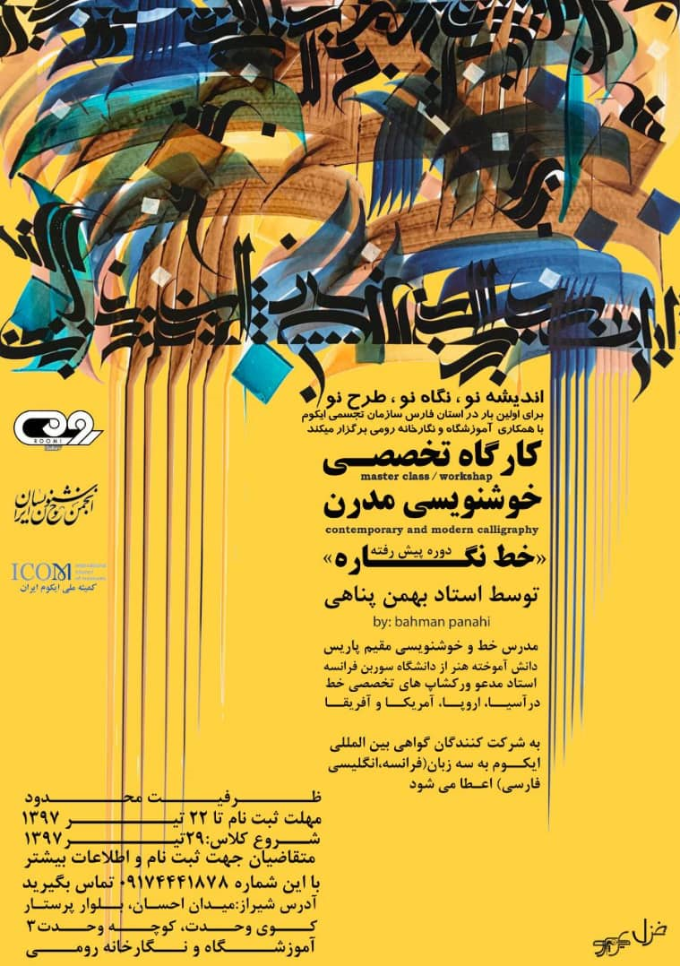 پس از برگزاری موفق کارگاه تخصصی خوشنویسى مدرن (خط نگاره) با تدریس بهمن پناهی در تهران، دومین دوره این کارگاه در شیراز برگزار میشود.کارگاه تخصصی خوشنویسى مدرن (خط نگاره) با تدریس بهمن پناهی در تهران برگزار میشود.