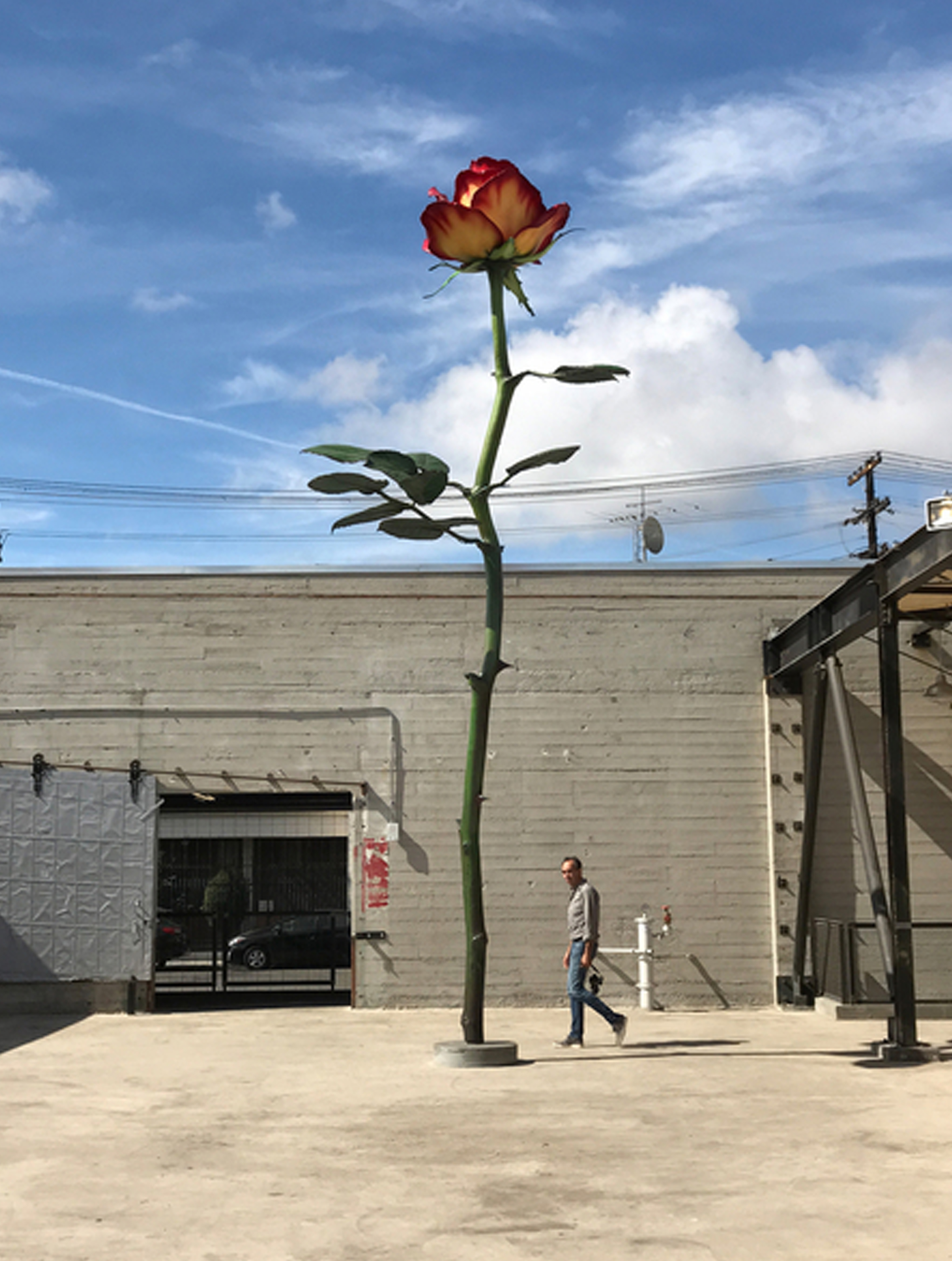 مجسمه ای با ارتفاع بیش از 8 متر در شکل گل رز، یک ریخته گری آلومینیوم لاکدار با هسته فولادی است که با وجود وزن آن حدود 500 کیلوگرم، تنها با چهار پیچ، سر پا می ماند.
