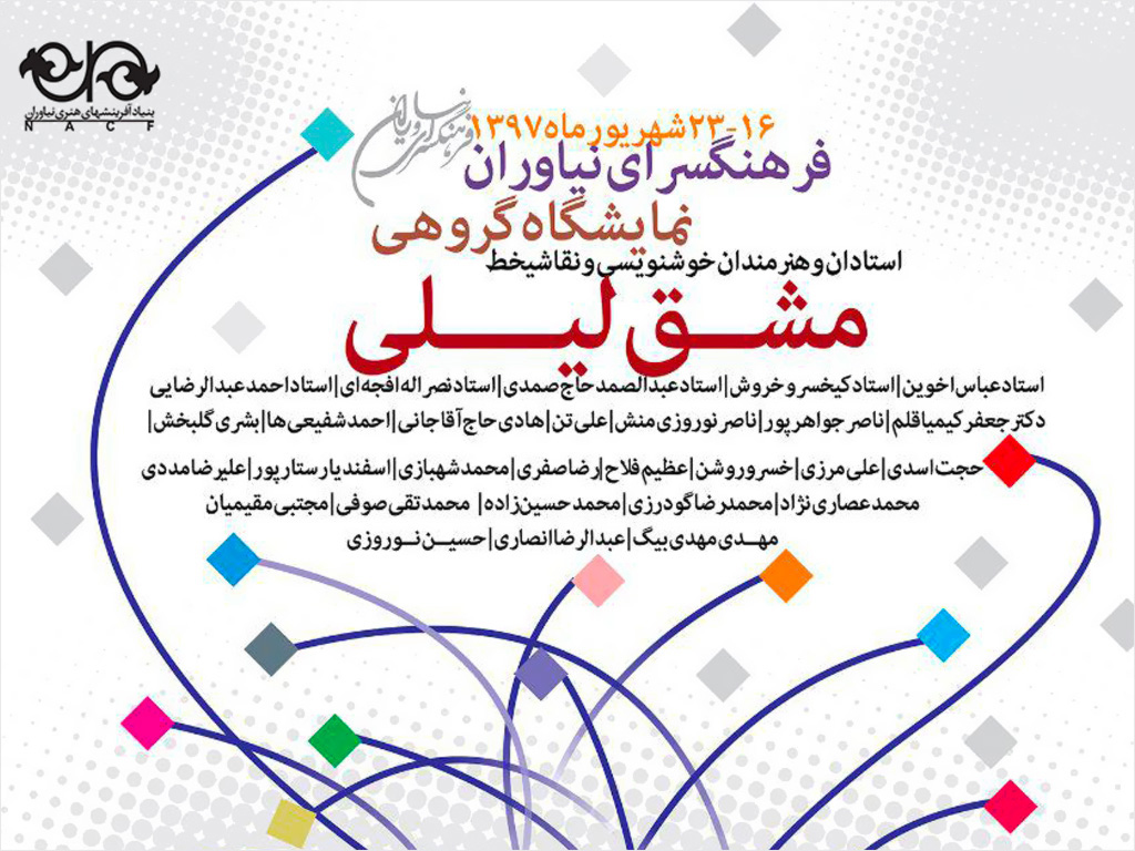 به گزارش روابط عمومی مرکز تجسمی حوزه هنری، فرهنگسرای نیاوران در هفته سوم شهریورماه، میزبان آثار جمعی از اساتید حوزه خوشنویسی و نقاشیخط کشور خواهد بود که نام این نمایشگاه گروهی «مشق لیلی» است.
