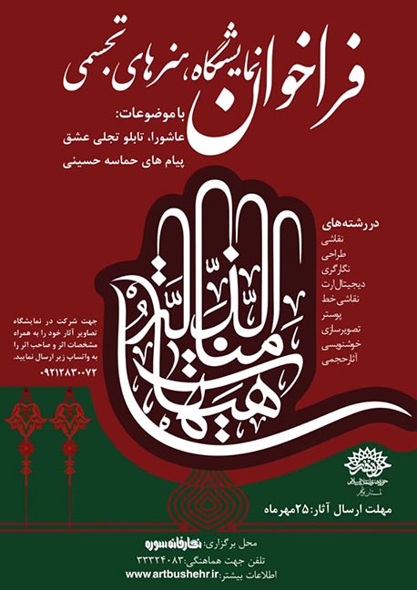به گزارش روابط عمومی حوزه هنری بوشهر، فراخوان نمایشگاه، هنرهای تجسمی با موضوعات عاشورا، تابلو تجلی عشق پیامهای حماسه حسینی در رشتههای نقاشی، طراحی، نگارگری، دیجیتال ارت، نقاشی خط، پوستر، تصویرسازی، خوشنویسی و آثار حجمی منتشر شد.