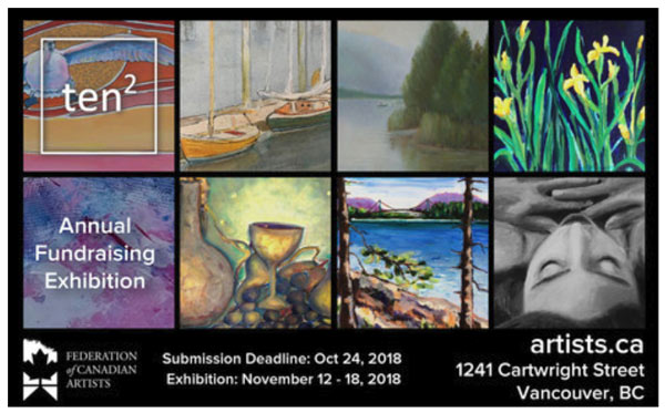 بیافرین کانادا از همه هنرمندان علاقمند به حضور در نمایشگاه بینالمللی سالانه خیریه TEN SQUARED در سال ۲۰۱۸ که توسط فدراسیون هنرمندان کانادایی (FCA) در گالری این سازمان هنری در شهر ونکوور کشور کانادا برگزار میشود دعوت میکند تا آثارشان را برای حضور در نمایشگاه این رقابت، از طریق پورتال بیافرین ارسال کنند.