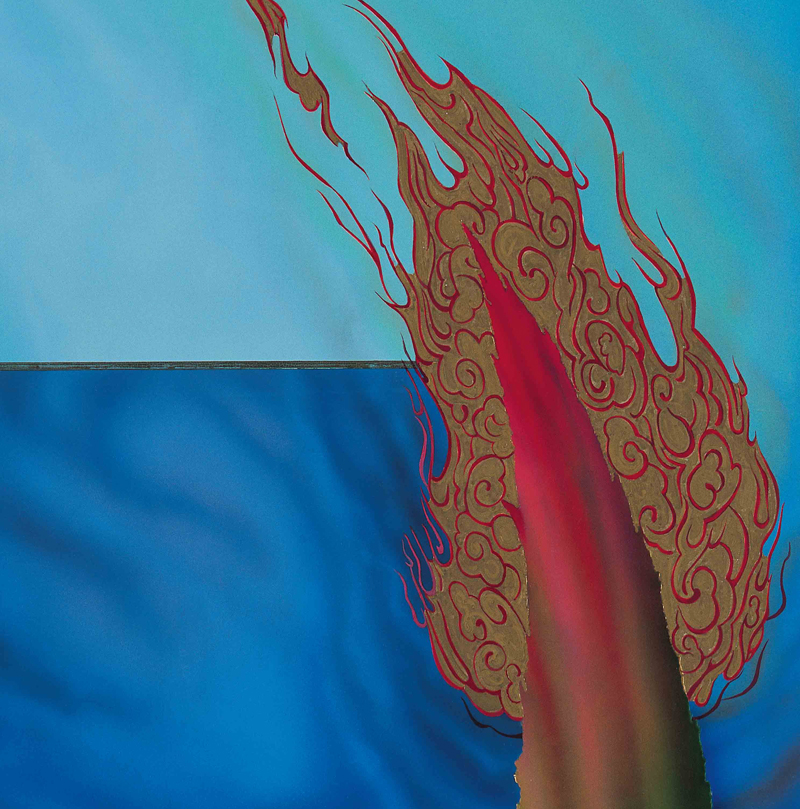 کادری در یک کادر دیگر و رنگهایی که گویی در این دنیا به تصویر کشیده نشده است. درختی که در باد می رقصد و کاکلش در حال سوختن است و و بر کمر شالی با کلامی الهی نقش بندی شده دارد. هنرمند ما را با این توضیحات به لحظه ای اشاره می دهد که خداوند در کوه طور با موسی(ع) صحبت می کند.