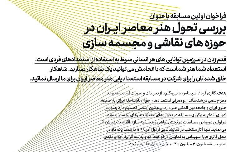 این گالری در اولین دوره مسابقه با عنوان بررسی تحول هنر معاصر ایـــران، در بخش نقاشی و مجسمهسازی اقدام به پذیرش آثار میکند. کلیه آثار منتخب در نمایشگاهی از اول آذر ١٣٩٨ به مدت یک ماه در محل گالری فریا / اسپیناس به نمایش درخواهند آمد و به سه اثر برتر جوایز نقدی به ترتیب ۵ میلیون، ٣ میلیون و ٢ میلیون تومان تعلق میگیرد.