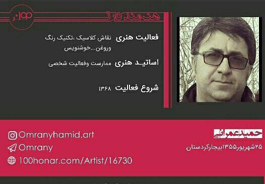 حمید عمرانی متولد ۱۳۵۵ بیجار از سال ۱۳۶۸ به صورت خود آموخته و با علاقه وپشتکار در عرصه هنرفعالیت خود را آغاز نموده و در این مدت توانسته است علاوه بر فعالیت در زمینه نقاشی، در خوشنویسی نیز با دریافت مدرک ممتاز موفقیت های ارزنده ای را کسب نماید.